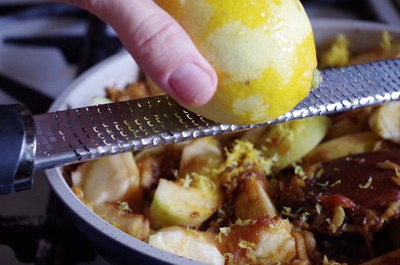 Выложила оставшиеся яблоки, нарезанные дольками, натерла цедры, выдавила лимонный сок, пару минут притомила и выключила.