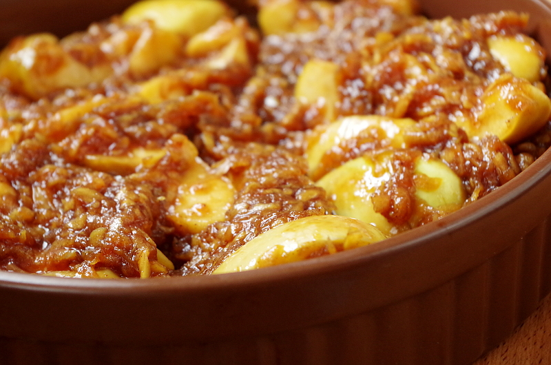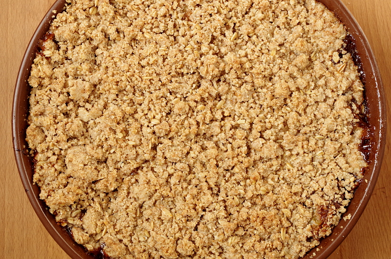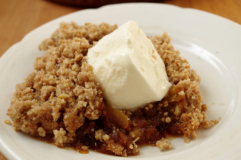 В последнее время все настолько бегом происходит, что готовить сложные блюда и выпечку нет никакой возможности, да и приходит понимание, что самая лучшая еда - самая простая, правда, правильно приготовленная. Овощи и рыба - минимум манипуляций, кексы, маффины, печенье, пироги - все чтоб раз-два и готово! Поэтому сегодня у нас крамбл! Если у вас есть фрукты или ягоды (любые, хоть замороженные, но летом, конечно, только свежие!), чашка муки, пара ложек сахара и сливочного масла, считайте, у вас есть пирог! А чтоб не возиться с готовкой, можно испечь крамбл - гениально ленивое английское изобретение. Крамбл переводится как “крошка”, и для этого пирога не нужно замешивать теста, достаточно выложить в форму подготовленные ягоды или фрукты, присыпать сахаром (по желанию), посыпать крошковатой смесью муки, масла и сахара и запечь. А подать теплым просто так или с мороженым, сливками или ванильным соусом. Это база. А, если пофантазировать, можно сделать карамель и протушить в ней фрукты, в крошку добавить овсяных хлопьев, орехов и кокосовой стружки, процесс от этого мало усложниться, а удовольствия будет море! Я решила приготовить не просто крамбл, интересно было сделать вариант по мотивам рецепта известного повара-скандалиста Гордна Рамзи. А там сначала надо сделать карамель, часть яблок натереть, а часть порезать дольками, протушить это все в карамели, сделать крошку из муки и овсянки и запечь. Не очень сложно, да? :)