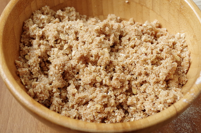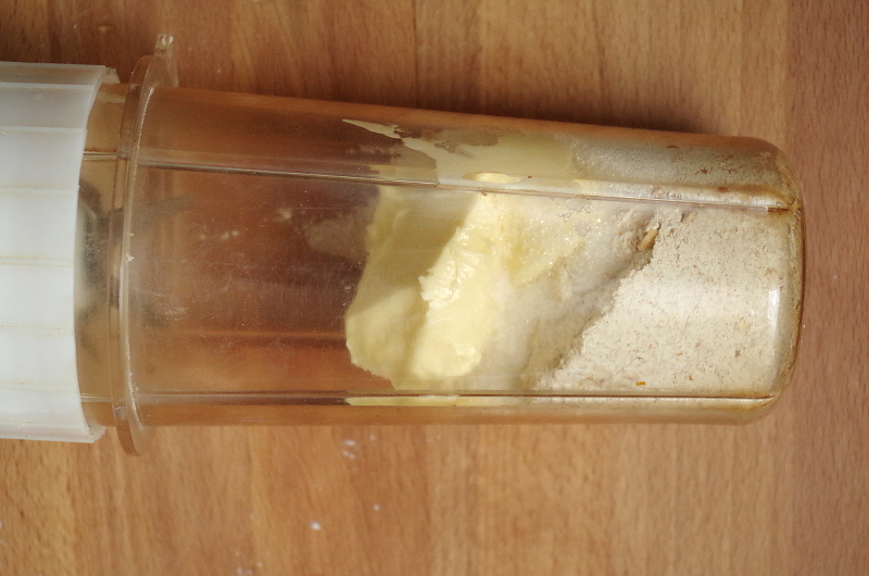 В блендере порционно (у меня небольшой персональный смузи-блендер Tribest, которым я измельчаю все подряд) смешала муку, хлопья, сахар и масло, чтоб плучилась крошка.