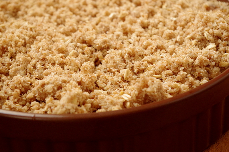 Высыпала крошку сверху на яблоки, равномерно распределила.