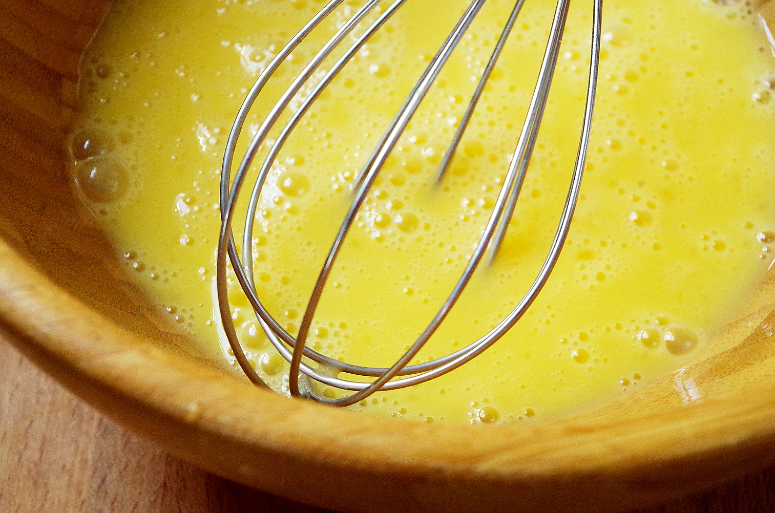 - 4 яйца и 1 желток слегка взбейте венчиком, белок пока не трогайте.