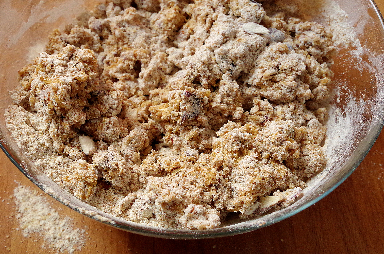 - Смешайте с мукой сахар, соль и разрыхлитель, добавьте рубленный миндаль и клюкву, перемешайте.
