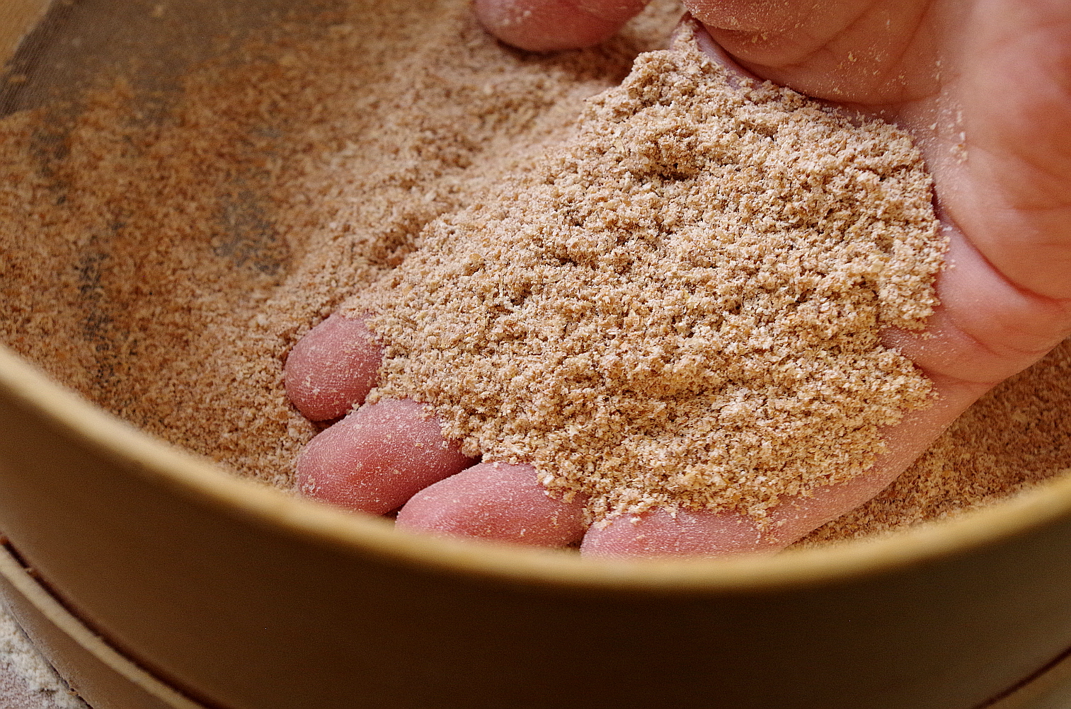 Перед замесом смолола муку на своей домашней мельнице и просеяла ее на мелком сите, получилась тонкая светлая мука.