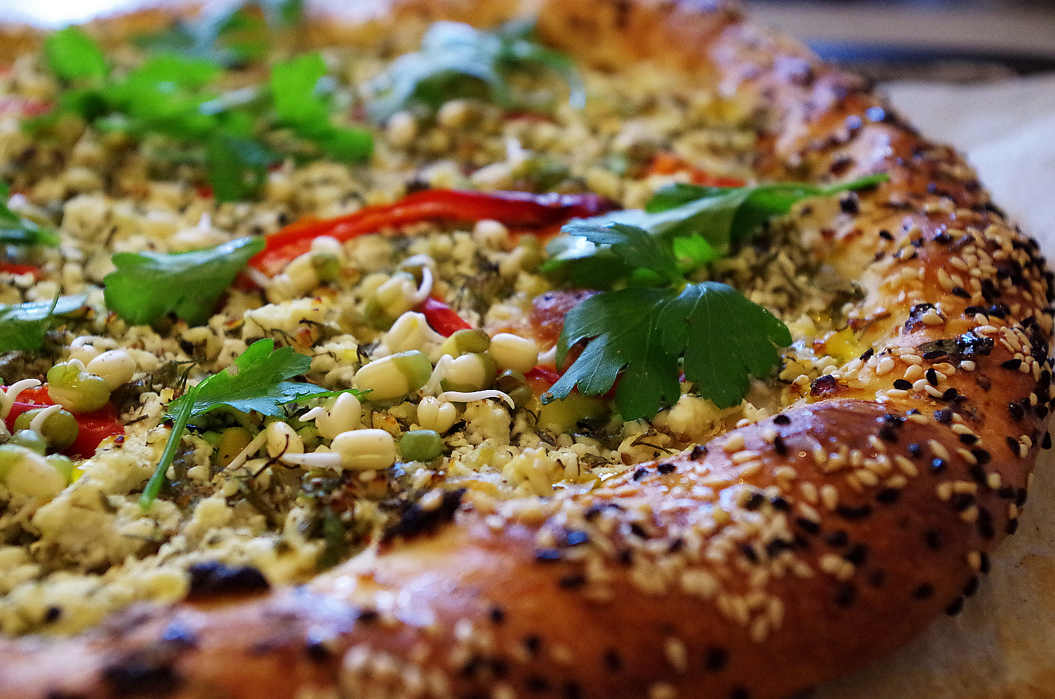 С творогом и зеленью все просто: творог зернистый, если есть жидкость - слить. Тесто сразу после брожения растянуть или раскатать в лепешку (или как пиццу - выдавить пузыри на края, сильно примяв серединку), смазать сметаной, выложить творог, смешанный с зеленью, можно овощей каких-нибудь, отступив от ботиков 3-4 см., краешки можно так оставить, а можно защипать как-то фигурно, и сразу печь. Как пиццу формовать, посмотрите в рецепте "Пицца за бортом", там и фото, и видео.