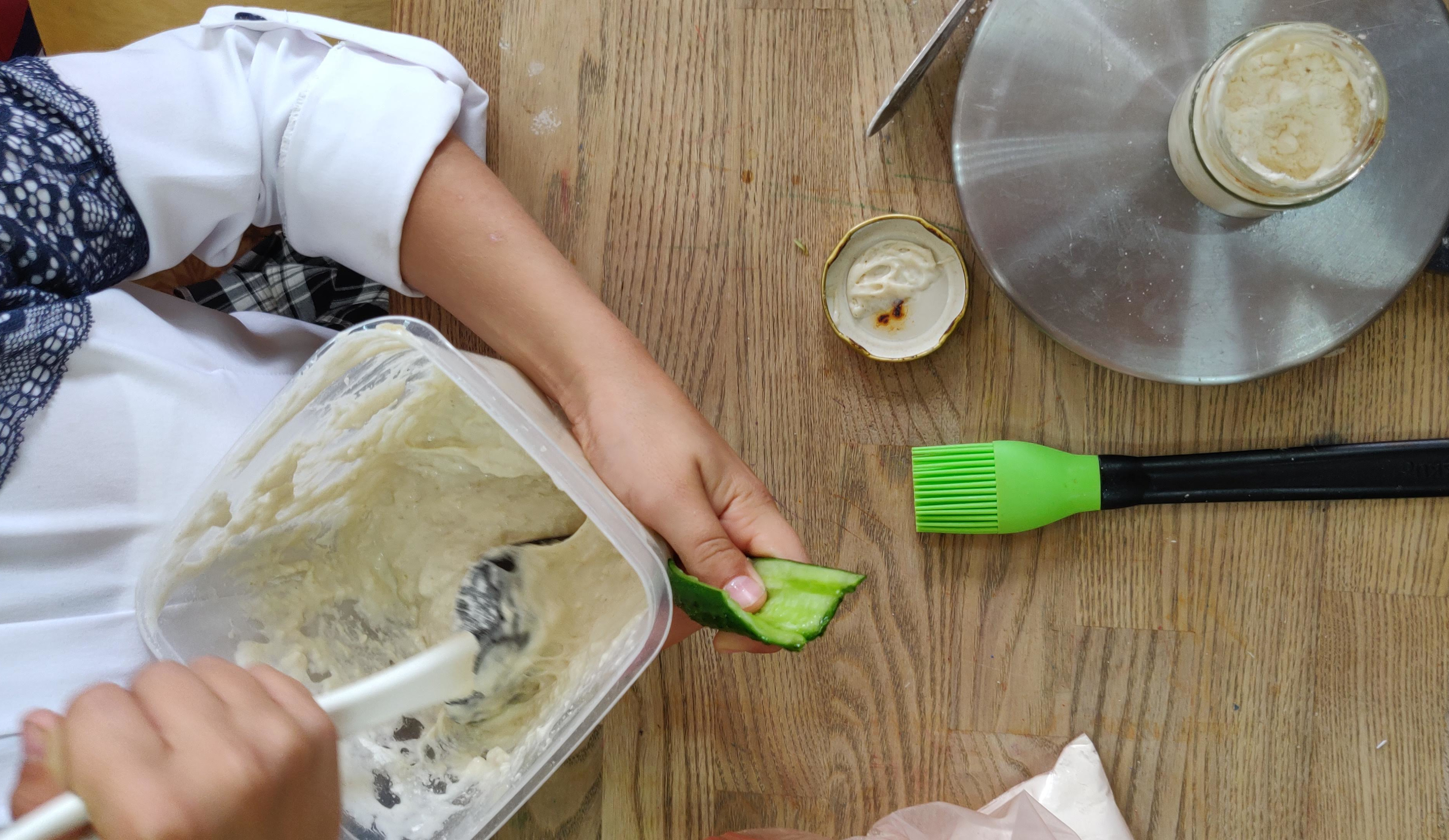 Смешайте закваску и воду, добавьте муку и оставьте на 20-30 мин. Добавьте соль и сахар иначните замес, пока тесто не перестанет сильно липнуть. У нас с детьми на это ушло около 15 мин.