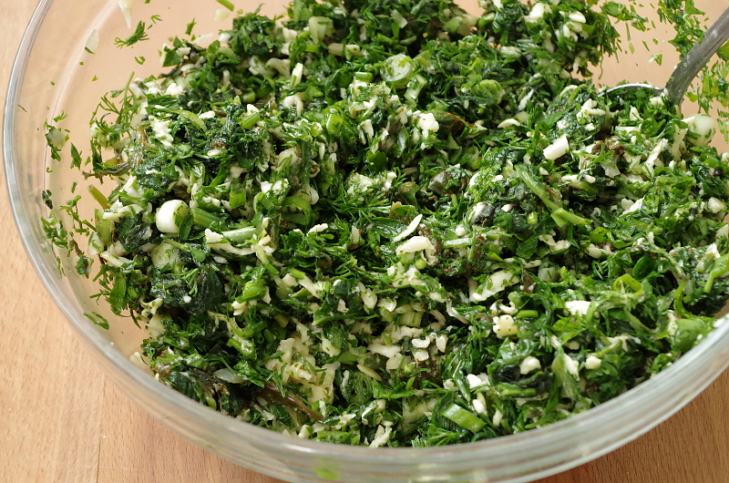- Когда зелень остынет, добавьте к ней натертый сыр и рубленные петрушку, укроп и зеленый лук.