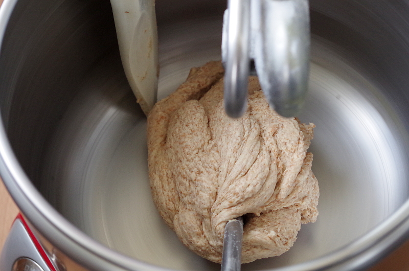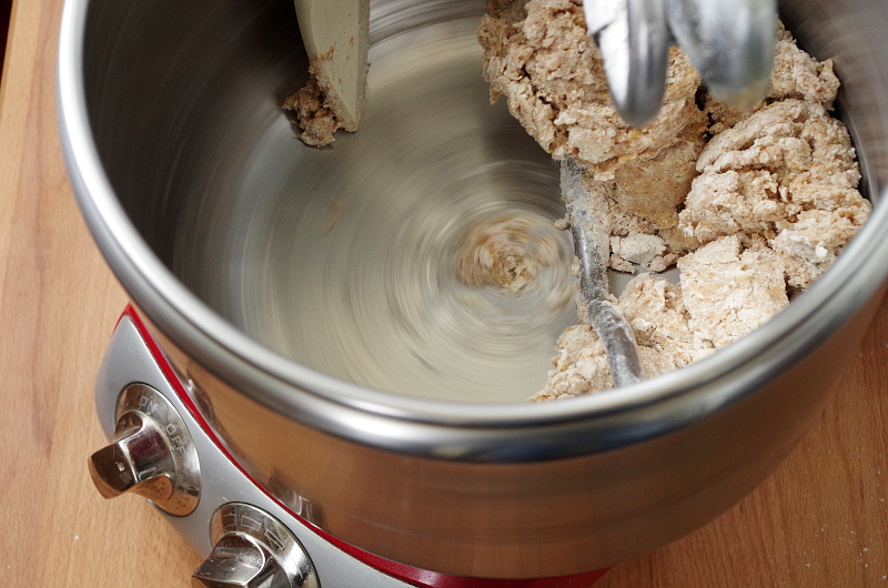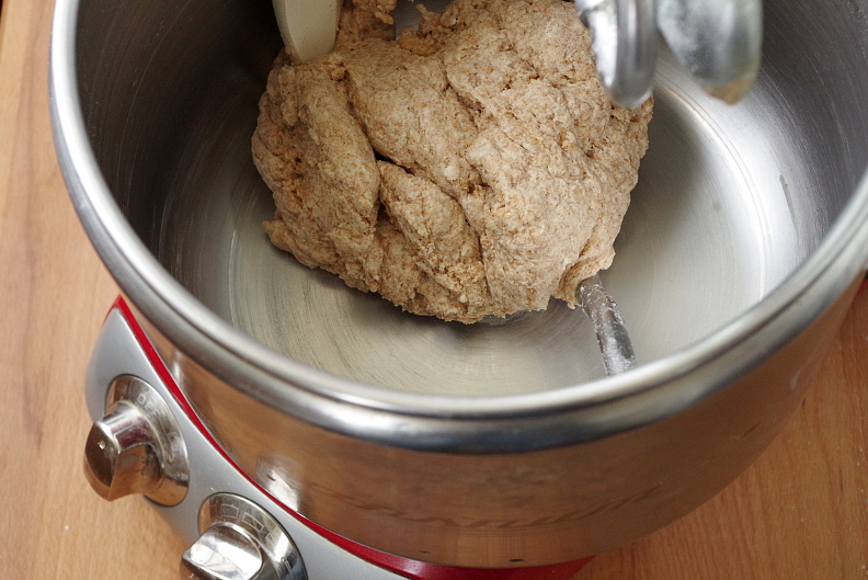 - В тестомесе или руками смешайте все ингредиенты и оставьте на полчаса. Это нужно не столько для клейковины, сколько для того, чтоб набухли отруби и прочие грубые частицы. Если после этого тесто будет слишком тугим и грубым (от муки зависит), добавьте немного молока или воды.