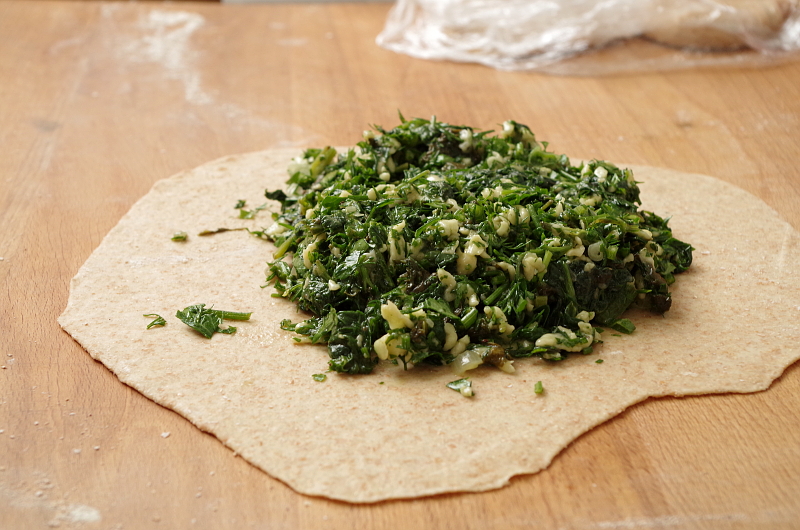 - Выложите в середину лепешки 2-2,5 ст.л. начинки.
