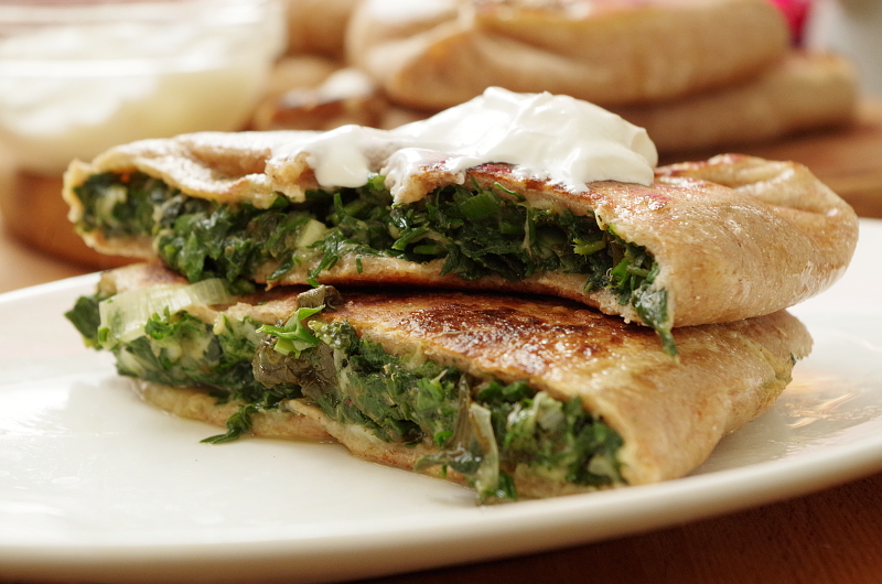 Друзья, привет! Сегодня у нас супер-рецепт: плоский хлеб, начиненный сочной весенней зеленью. Это из разряда кутабов и прочих тонких лепешек в кавказском стиле, но я не решилась присваивать им какое-то конкретное название, чтоб не претендовать на аутентичность. Я сделала цельнозерновое тесто с небольшой добавкой белой муки, купила на рынке здоровенный пакет зелени и наконец-то их испекла! Сделайте и вы, это невероятно вкусно, а еще и полезно!
