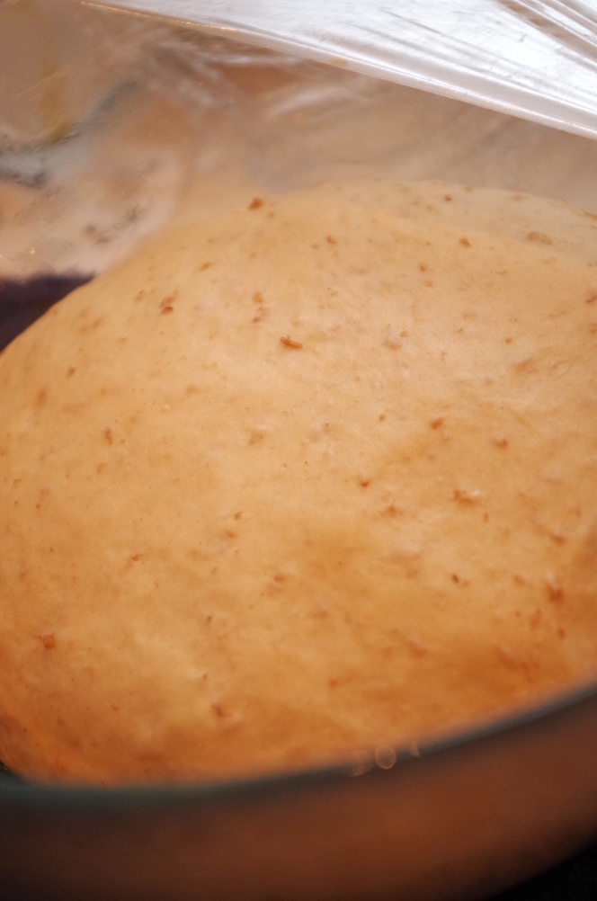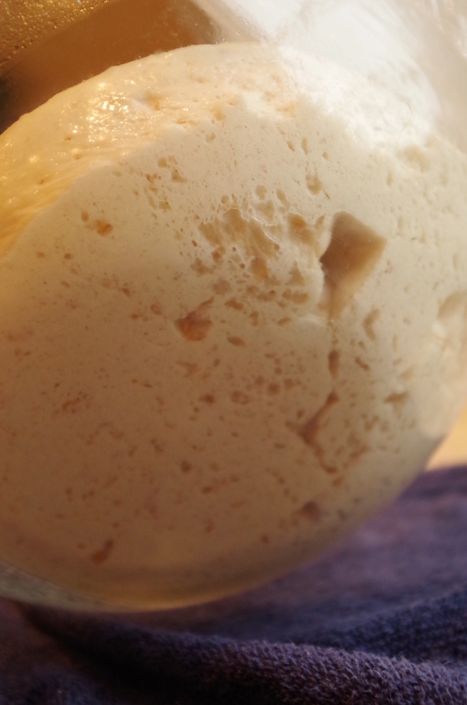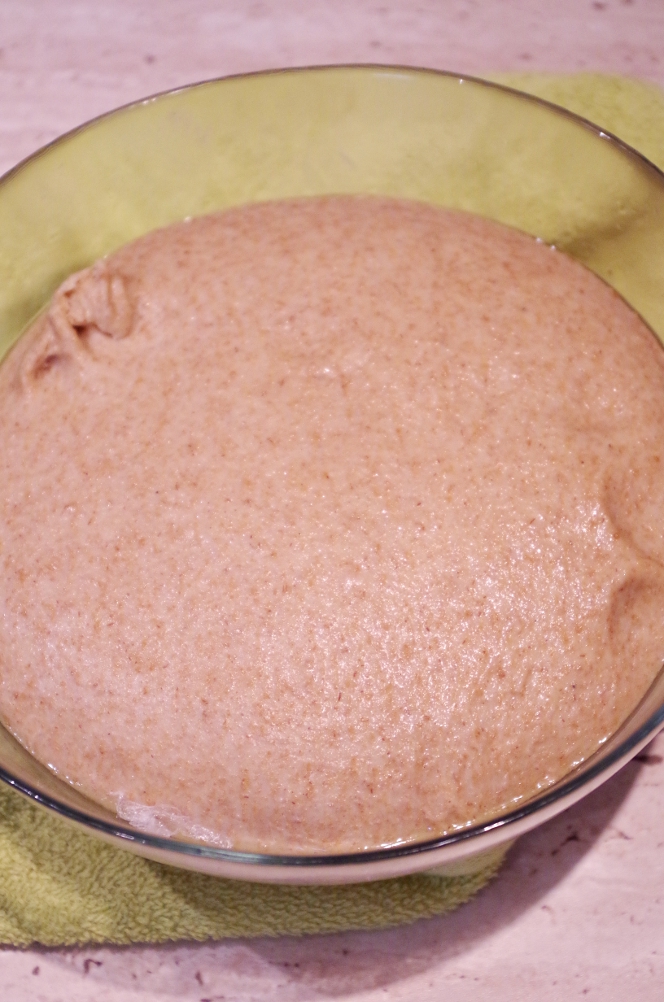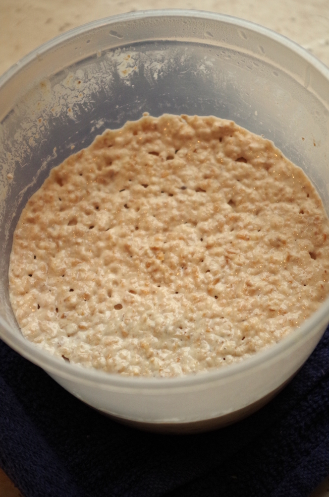 У меня не было сухих гранул Секова (я же в гостях и, само собой, забыла дома банку с сухим бакферментом), которые обычно дополнительно добавляют в тесто для ускорения ферметации, поэтому эту экспериментальную выпечку можно считать вдвойне экспериментальной. Опару оставила в стеклянной миске, смазанной растительным маслом и затянутой пленкой, при температуре около 30 градусов. В общей сложности опара созревала 4,5 часа и выглядела вот так: