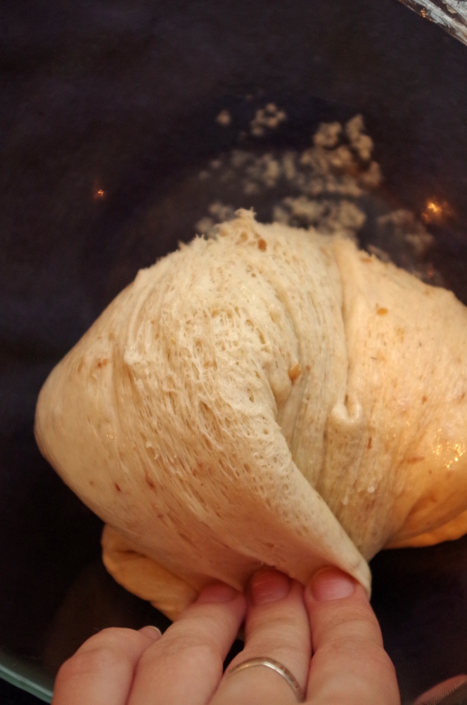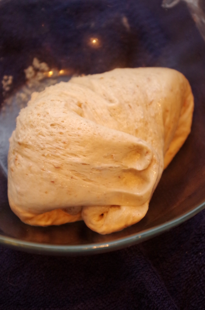 Замесила гладкое эластичное тесто. Как только оно перестало липнуть к рукам и посуде, стала вмешивать сливочное масло: распластывала тесто в лепешку, руку окунала в чашку с растопленным маслом, смазывала тесто, сворачивала конвертом и вымешивала, пока все масло не войдет в тесто. И так, пока все 100 гр. растопленного масла не оказались в тесто. В процессе вмесила в тесто соль. Сначала в процессе замеса тесто было довольно крутым и очень упругим, но по мере прибавления в нем масла, оно становилось мягче и податливее. В итоге получилось не тугое, но и не влажное мягкое приятное тесто. Подкатала его в шар, положила в смазанную растительным маслом миску и оставила подходить при температуре около 30 градусов. За 2,5 часа тесто заметно подросло.
