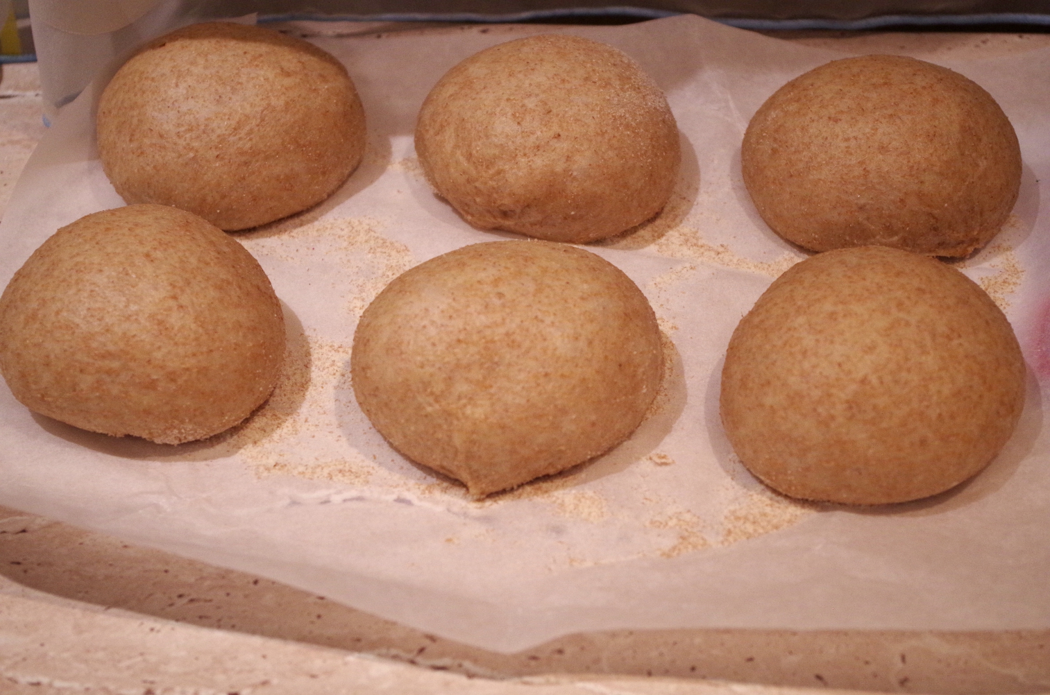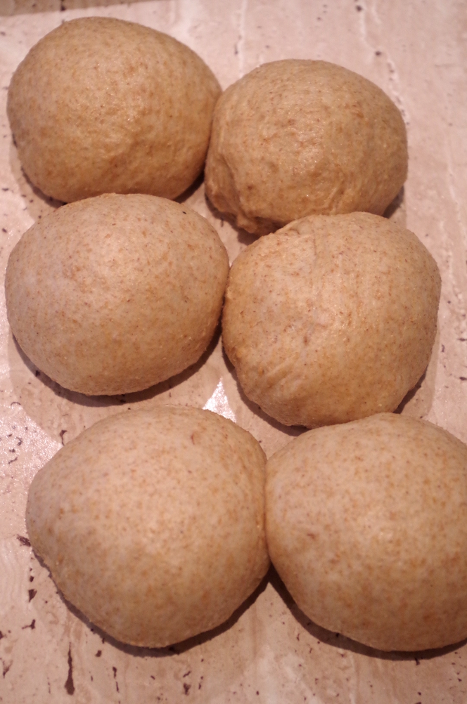 Вывалила его на стол, разделила на шесть одинаковых кусочков по 205 гр. и подкатала каждый из них в шар, дала им отдохнуть 15 минут под полотенцем.