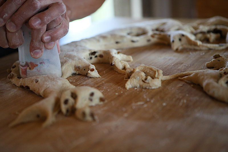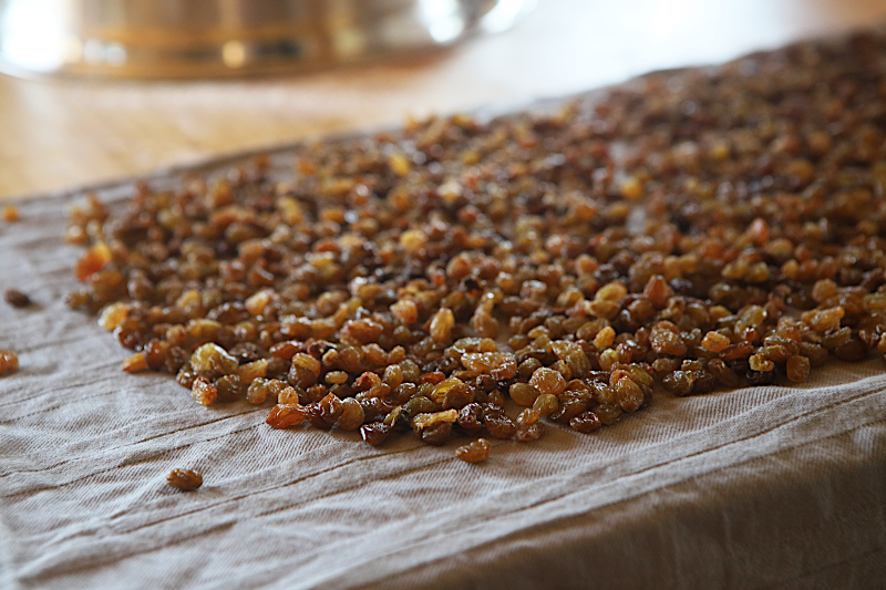 Включите духовку греться до 200-220° с камнем, изюм промойте к кипятке, воду слейте, изюм подсушите на полотенце.