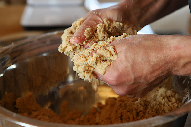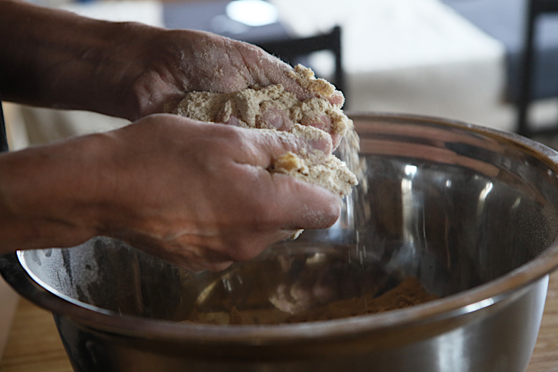 Следом внесите мед и тоже тщательно разотрите с мукой.