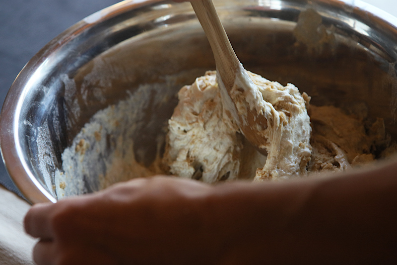 Влейте опару и хорошо перемешайте, оставьте на 30 минут, чтоб отруби и грубые частицы муки набухли.