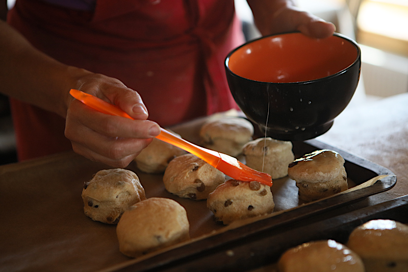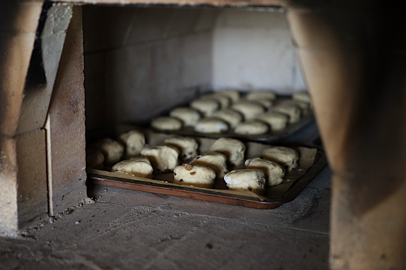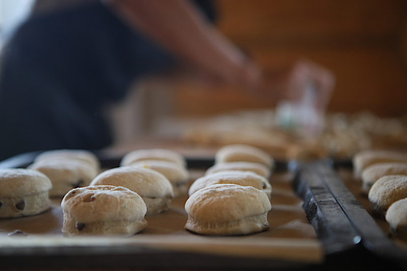 Смажьте сконы яйцом и тут же отправьте в печь на камень! Выпечка при 200° около 20 мин. В своей дровяной печи Олег печет при температуре 240-250°.