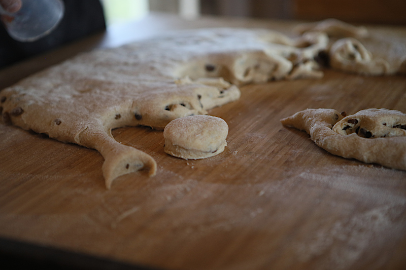 Выложите тесто на стол, несколько раз сложите или сделайте короткий промес (особо развивать клейковину не надо, иначе сконы будут затянутой структуры). Растяните тесто в лепешку и внесите изюм методом складывания теста конвертом. Изюм вносите в 3-4 этапа.