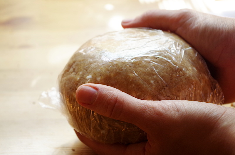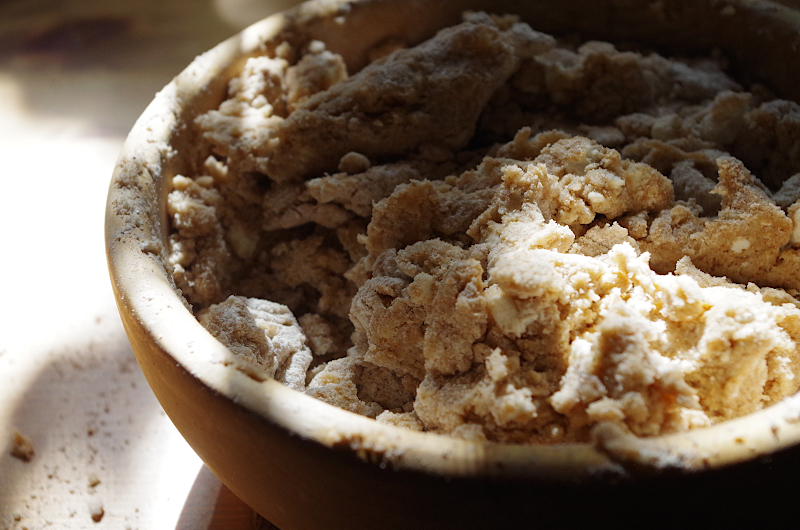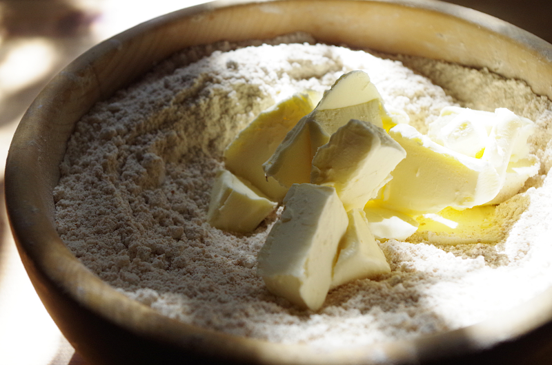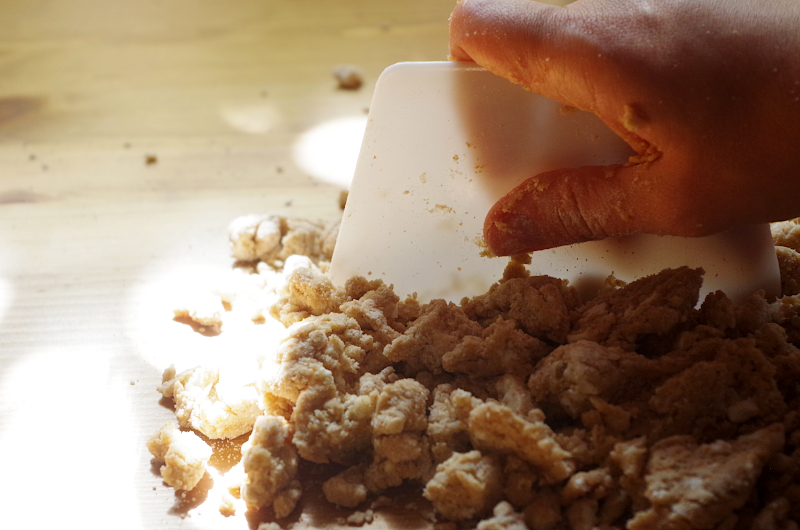 Добавьте холодное масло кусочками и перетрите в крошку. Это можно и руками сделать, и в блендере. Если используете жидкий подсластитель или мед, добавьте на этом этапе и перетрите с мукой.