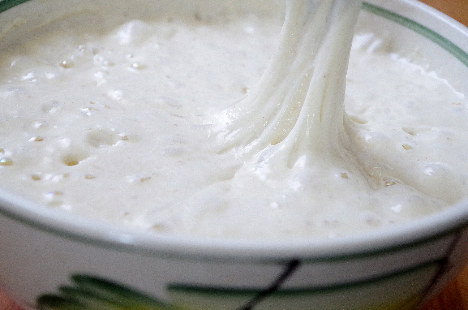 В воде размешайте стартер, добавьте муку, перемешайте до полного ее увлажнения, затяните пленкой и оставьте примерно на 8 часов при температуре 23-15 градусов. Закваска увеличится в объеме, будет пышной и пронизанной пузырями. При этом она не должна иметь яркого кислого запаха или вкуса.