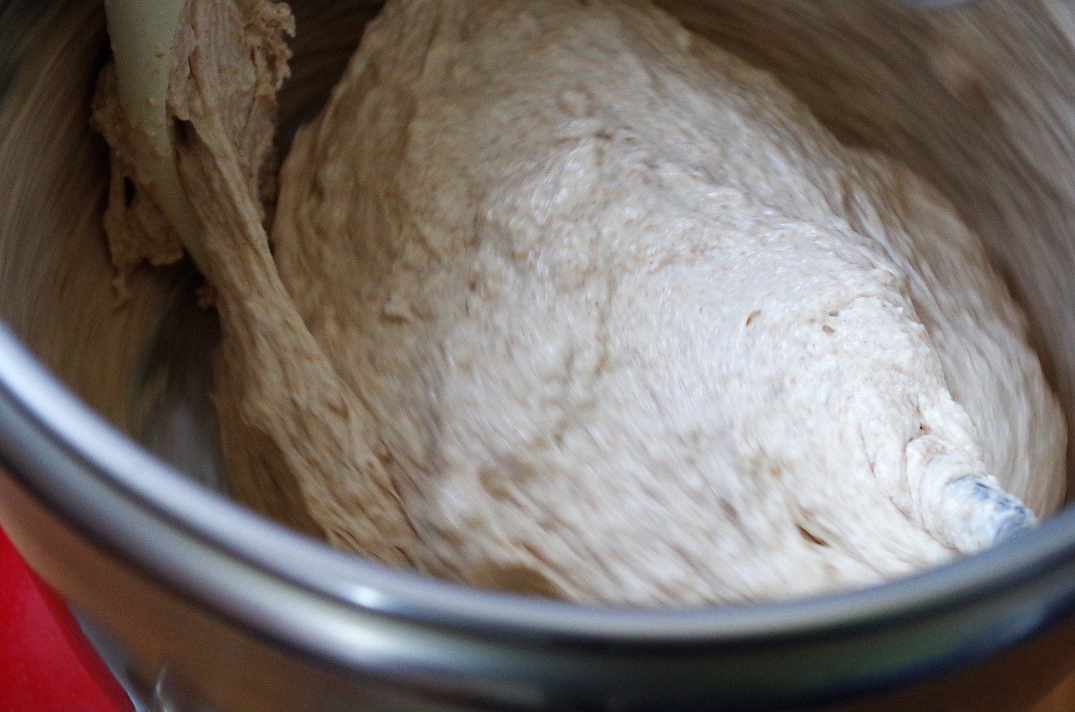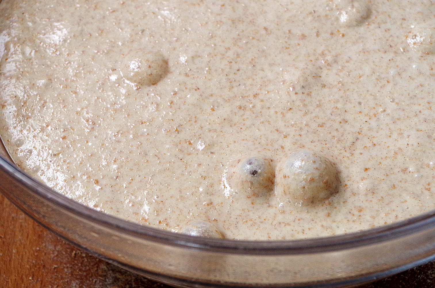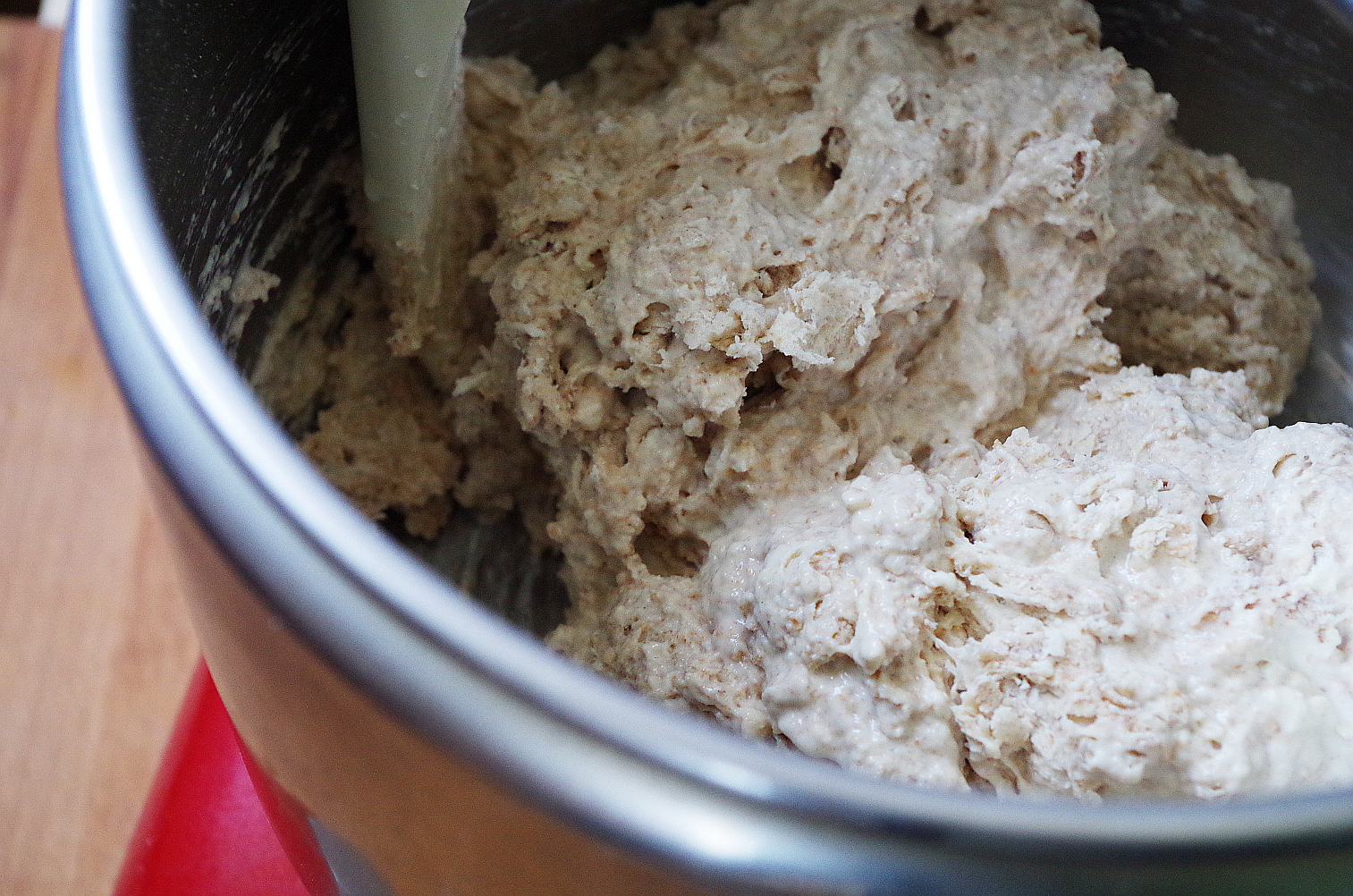 Я замешивала в тестомесе Ankarsrum Original, если вы замешиваете руками, то сделайте то же самое, только вручную: смешайте всю закваску, муку и 700 гр. воды по полного увлажнения муки, оставьте на полчаса.