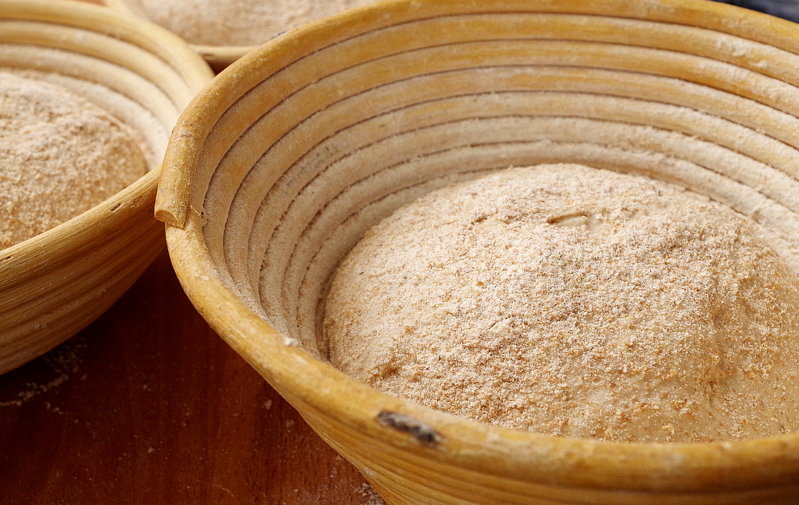 Сформуйте плотные заготовки, присыпьте мукой, корзинки при необходимости застелите тканью, натертой мукой, уложите тесто на расстойку швом вверх. Расстойка около 1,5 при комнатной температуре (25 градусов в среднем). Если у вас холодно, расстойка может занять больше времени, если жарко – не держите тесто дольше часа.