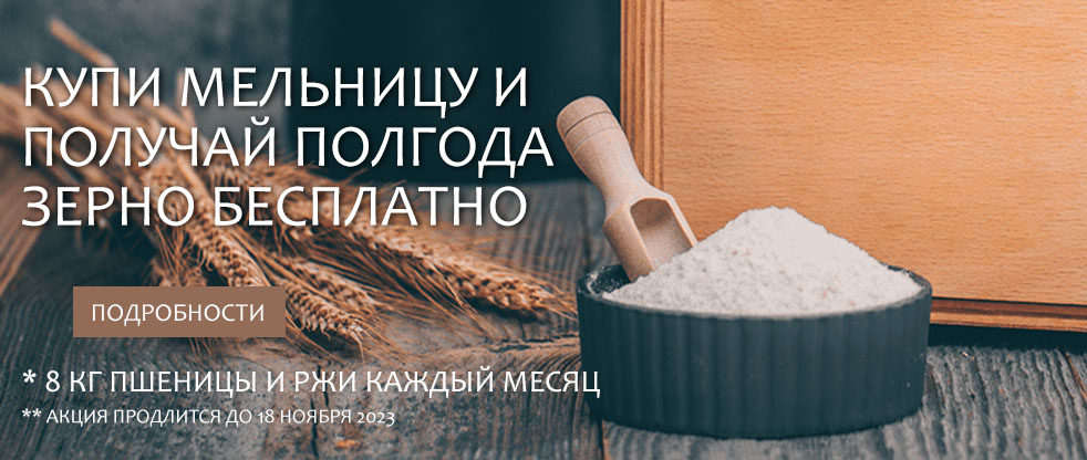 При покупке электрической мельницы до 18 ноября 2023 вы получаете бесплатную подписку на зерно на три или шесть месяцев, в зависимости от модели мельницы (список ниже).