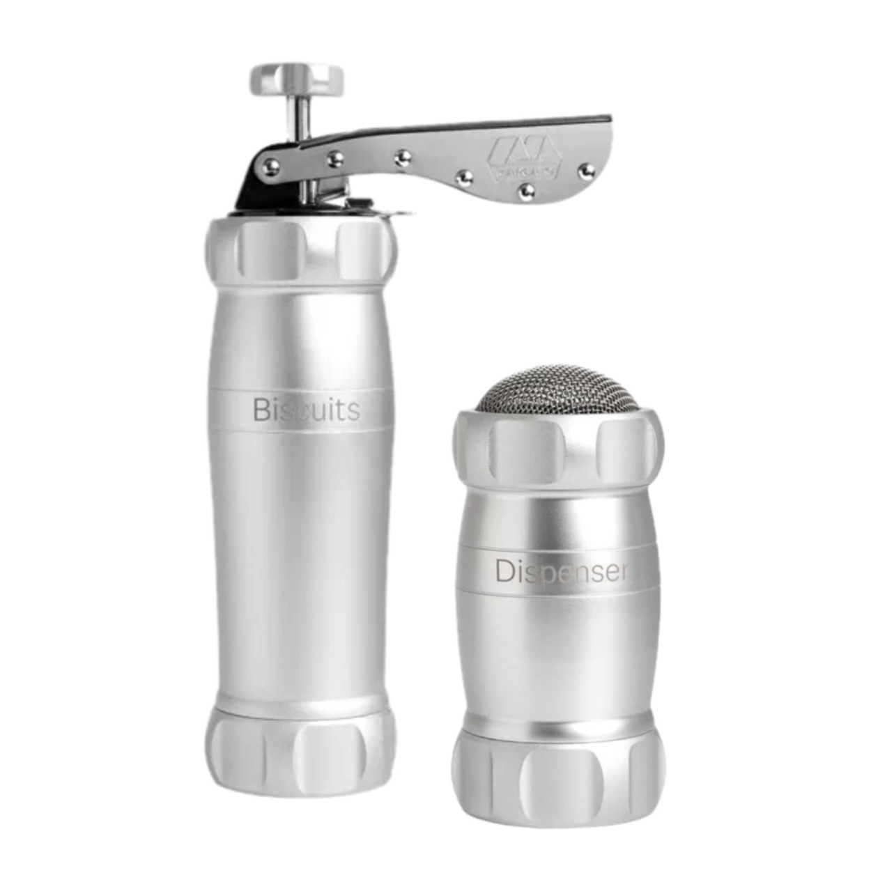 Пресс для печенья и сито для сахарной пудры, муки и какао в подарочной упаковке.